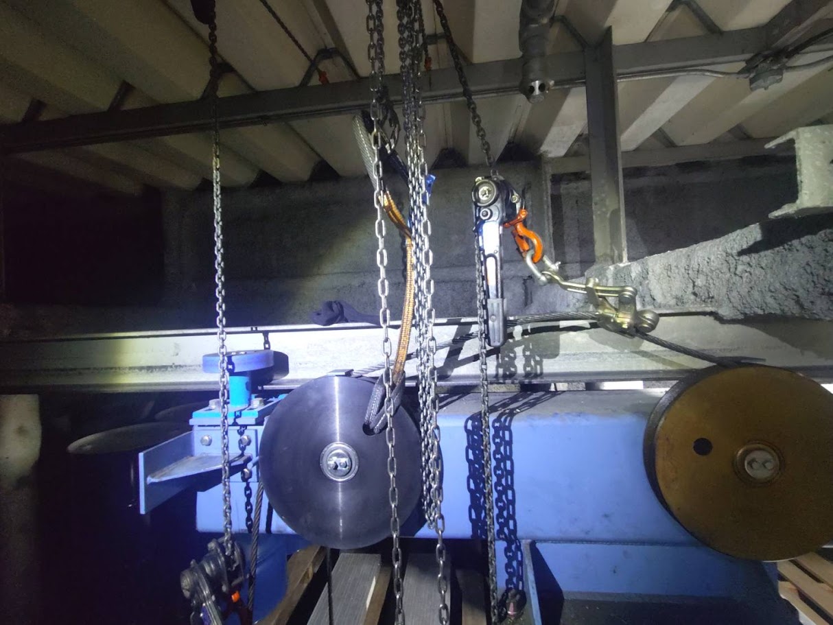 自動倉庫クレーン上部シーブの交換作業 高所は怖い・なれません!